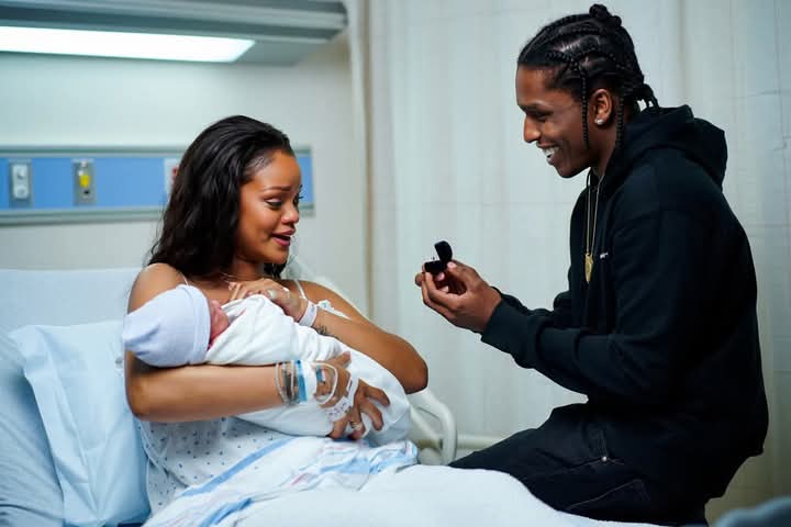 The couple embraced with their newborn daughter between them, surrounded by close family members, including Rihanna’s mother, Monica, who captured a brief clip of the proposal on her phone.