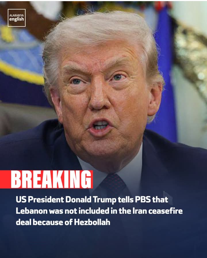 BREAKING:Trump Excludes Lebanon from Iran Ceasefire, Citing Hezbollah’s Role.