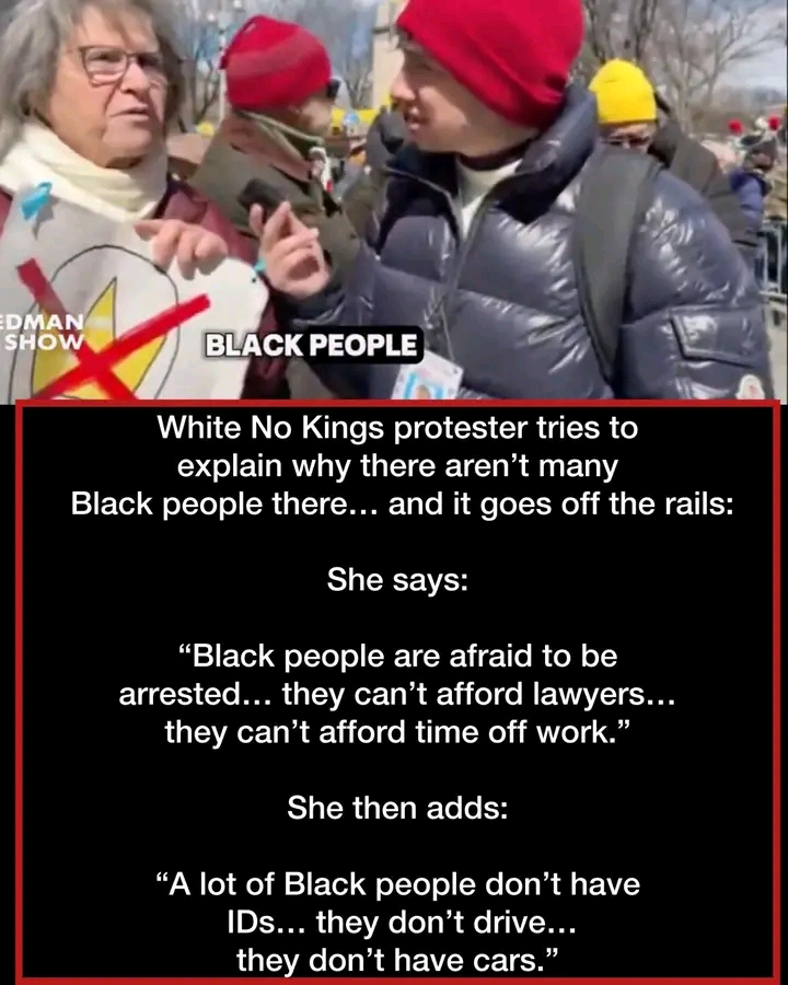 White No Kings protester tries to explain why there aren’t many Black people there… and it goes off the rails: She says:w